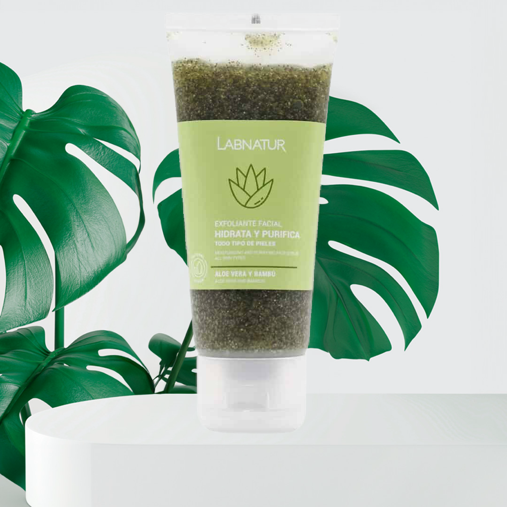 El Exfoliante Facial de Aloe Vera y Bambú regenera, hidrata, nutre, limpia y suaviza la piel. Elimina impurezas, células muertas y el exceso de grasa en el rostro. Conviene utilizarlo antes de la realización de otros tratamientos faciales, ya que ayuda a absorber otros productos cosméticos. La exfoliación arrastra las células muertas de la superficie de la piel, haciendo un barrido que le da luminosidad al rostro y que limpia las impurezas que se acumulan en esta parte del cuerpo. Gracias a esta exfoliación, la piel de la cara consigue tersura, suavidad y se prepara para la aplicación de tratamientos de belleza. En cualquier rutina facial es imprescindible el exfoliante, ya que es la única forma de liberar la piel muerta y volver a tener una piel fresca, suave, más lisa, sin impurezas y luminosa. Las imperfecciones como manchas, marcas de acné e incluso las finas líneas de expresión se reducen, sin olvidarnos de que la propia exfoliación junto con el masaje de la aplicación es una buena herramienta para mejorar la circulación y con ello llenar la piel de nutrientes. Otro beneficio, es que cualquier tratamiento como mascarillas, cremas faciales o sérum serán mucho más eficaces gracias a que los principios activos podrán penetrar más profundamente en la piel. Además en el caso de las pieles grasas, su uso regular es muy beneficioso para eliminar la suciedad de los poros. También disponemos del Exfoliante Facial de Caléndula y Camomila, ideal para pieles sensibles.